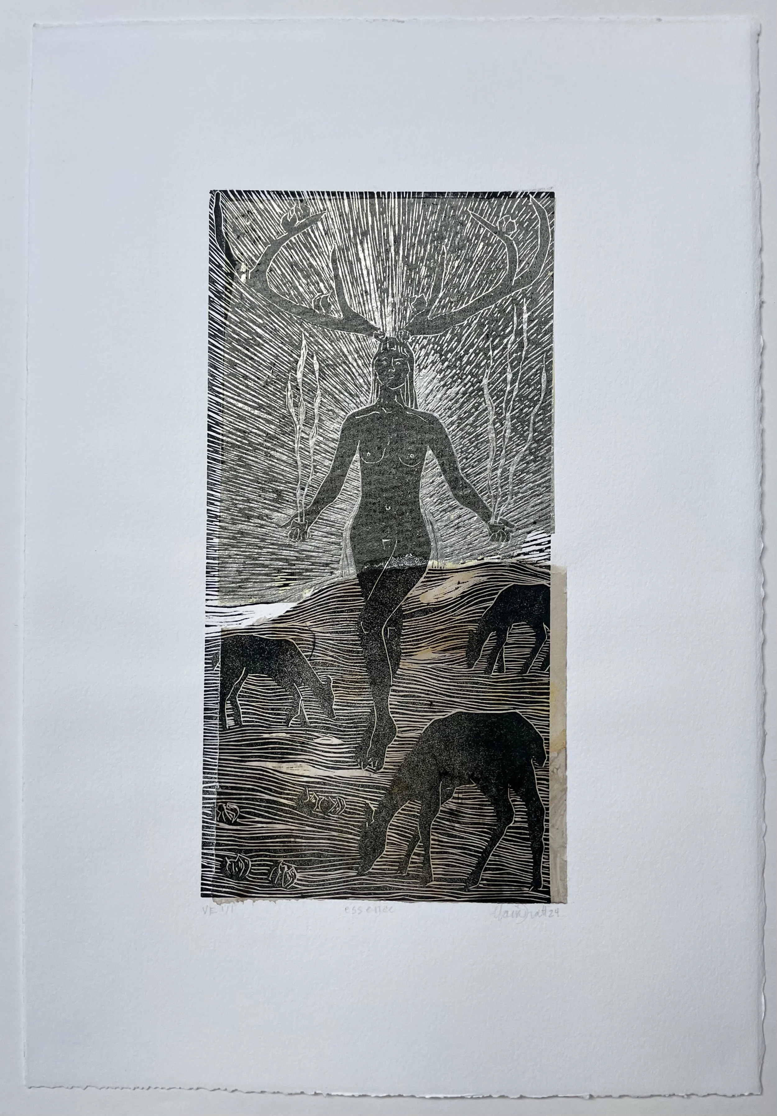 This self-portrait is a soft sculpture, approximately half of life size, of a woman’s body with a deer head. It is constructed from linen fabric that I hand-embroidered and is accompanied by a handmade book of my block prints of deer images. The figure is seated on a flat basket handwoven from cedar and sea grass and is surrounded by deer antlers.