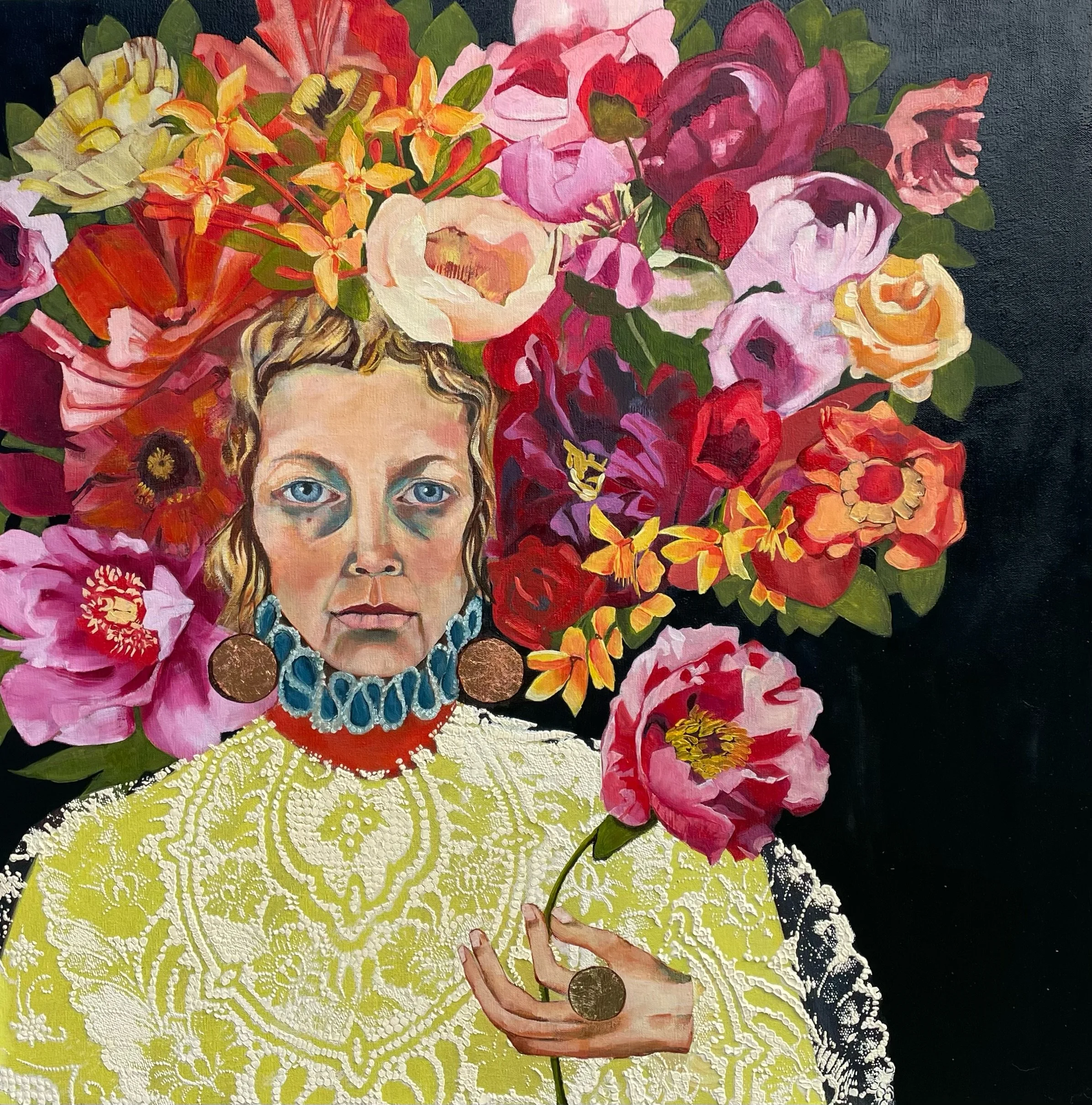 On a personal level, this portrait refers to, not just my love of flowers and wanting to be surrounded by them in the form of a Victorian headdress, but also speaks to how something - an object, a flower, in this case a peony - can be a tether to a significant event in one’s life. Ironically, the beautiful peony takes its place as a signifier of something more serious or profound.