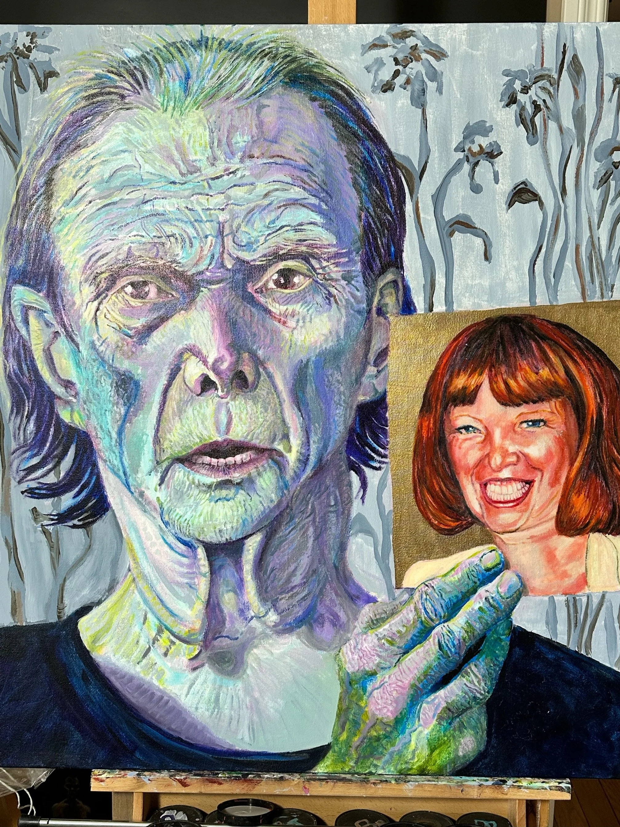 Self Portrait as a Green Man. This work depicts the ancient mythological horned Green Man which has many interpretations in various cultures. I personally relate to the Green Man as a figure rooted in place who silently endures through time and troubles.