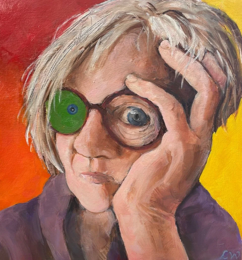 I have been a printmaker for over 30 years, and I have made various self portraits in the past decades, but this one has been one that I started during the covid lock-down and I recently finished it this Spring 2024. I think it reveals the solitude that comes to focus, when I put all my thoughts into finding my "it" place where I lose all concerns of the surround, and delve into colour, line, and joy: living in the moment.