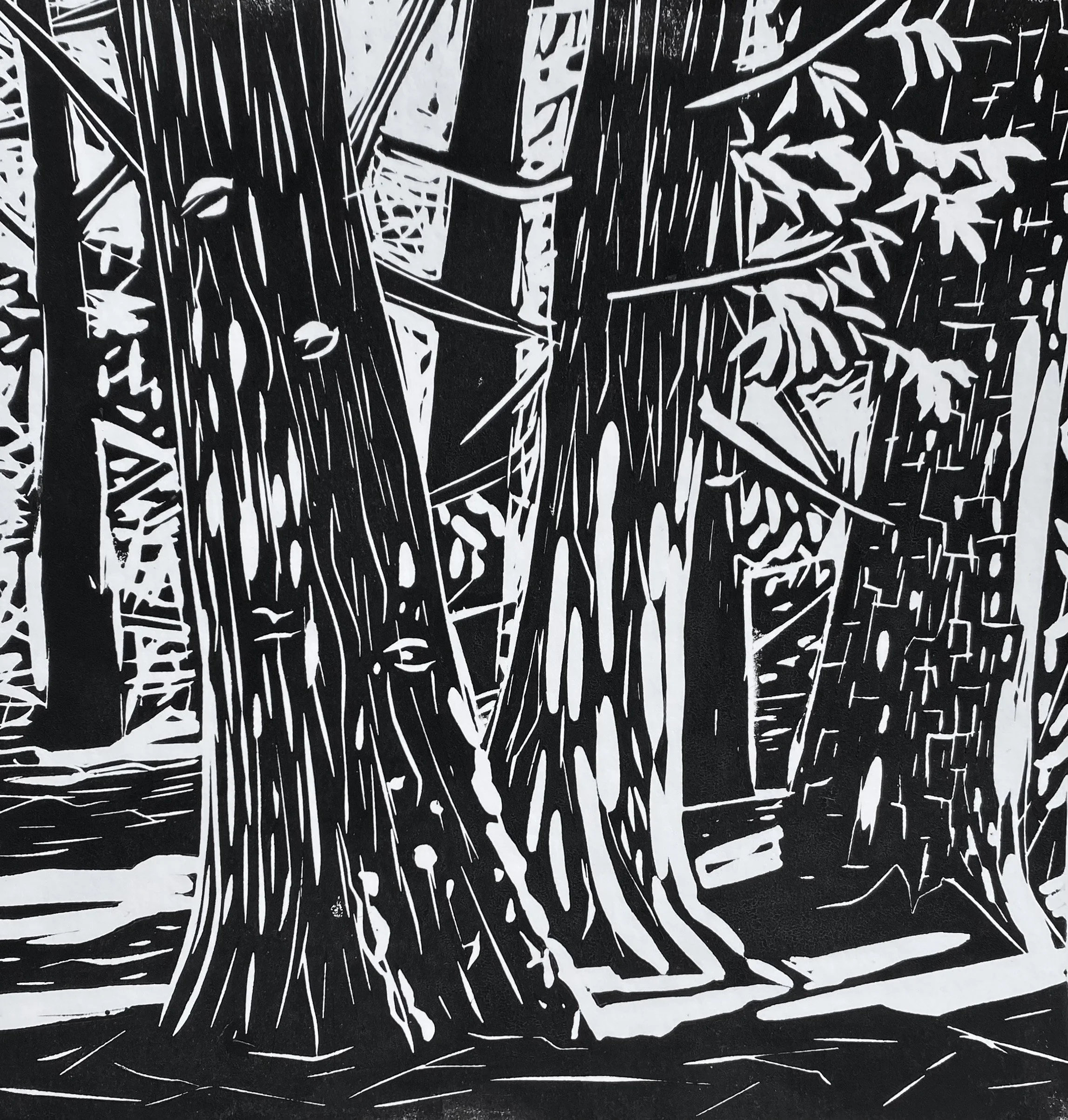 My art is primarily inspired by nature, so trees figure prominently in the various media I use to create. Even some of my jewelry pieces feature trees. This original scene inspired me due to the different types of barks on evergreens as seen on a rainy day. I was on site, finishing a plein air painting in oils when the light pierced through the branches. Photos preserved the scene, then I returned home to carve this block.