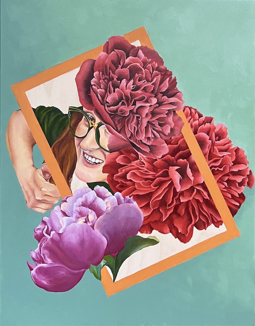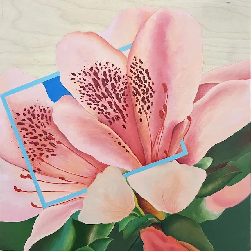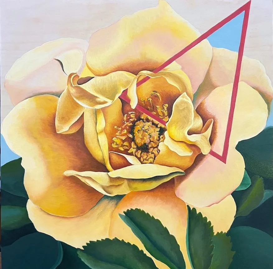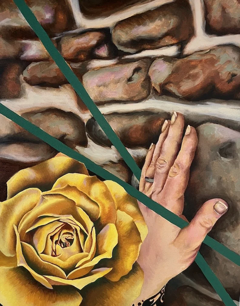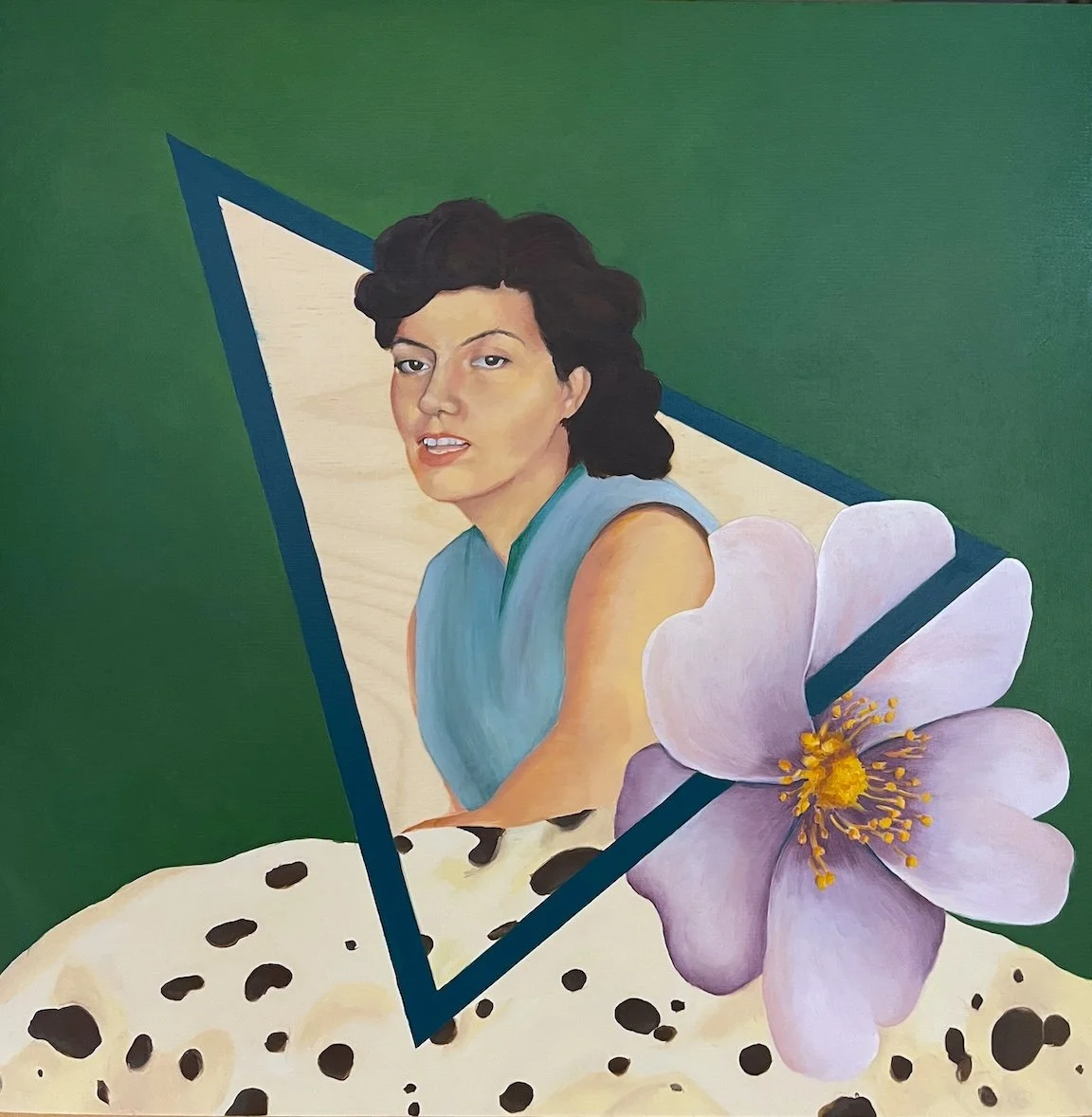 Visually, the paintings draw from analogue collage and surrealist imagery. Symbolic elements are layered to mirror the way memory and identity overlap. Flowers represent five women across generations; rings reference heirlooms now in my care; geometric forms point to the rules and structures that define our lives, now serving as points of navigation. Painted in bold colour using oil on wood panels or heavy paper, the materials speak to lineage, rootedness, and foundation.